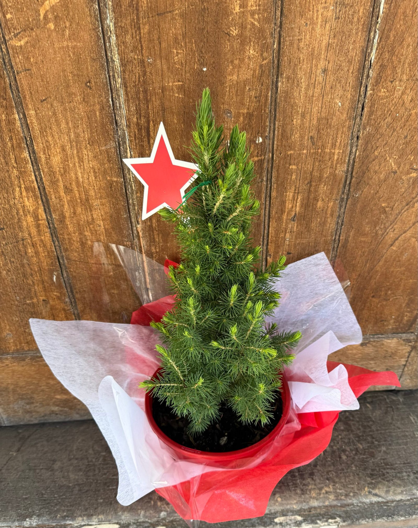 Bring the magic of the season into any space with our beautifully presented Mini Christmas Tree. This potted evergreen is the perfect blend of natural charm and holiday spirit, adorned with a classic red star topper and wrapped in premium non-woven fabric with a festive bow.